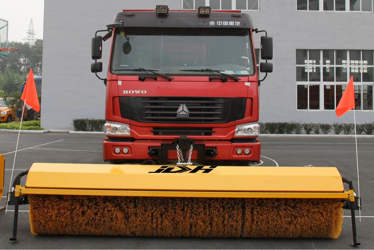 除雪滚刷采用双侧液压摆线马达驱动;滚刷支撑轮采用充气轮胎;滚刷颜色为工程黄,两端配有警示旗帜,除雪滚刷直径大,转速快,滚刷采优质刷毛,耐磨损,使用寿命长,车辆与设备采用驶入式快速连接。